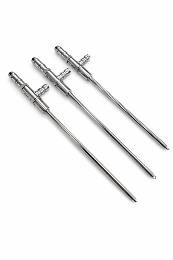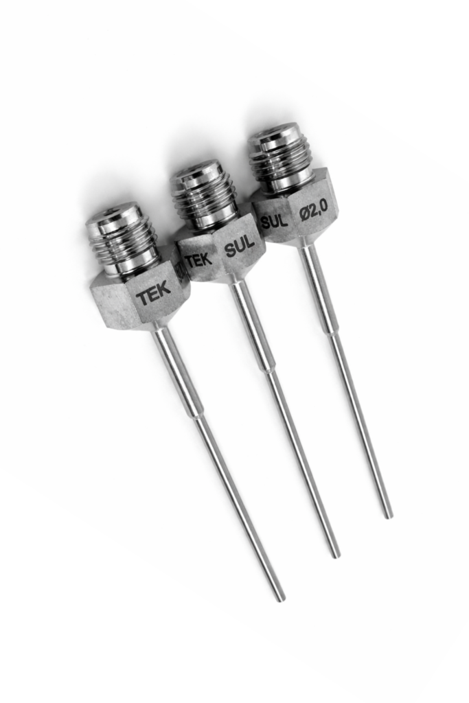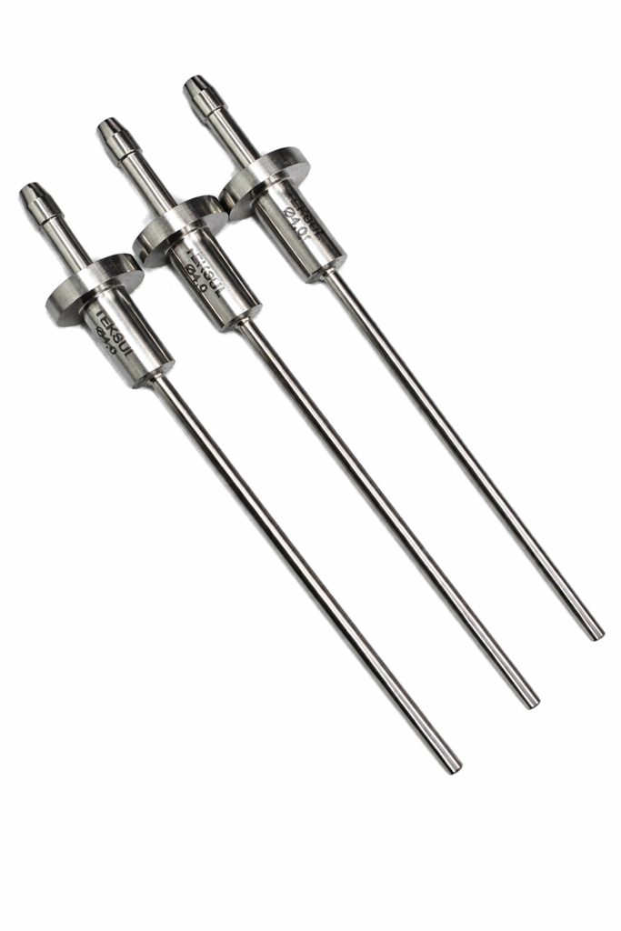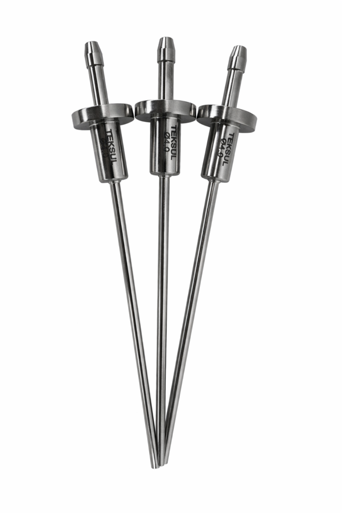 As agulhas de envase Teksul são fabricadas em aço inox 316L, eletropolidas e certificadas, garantindo alto padrão sanitário e facilidade de limpeza. A soldagem a laser assegura impermeabilidade e alinhamento preciso, enquanto a ponta bidirecional a 60° direciona o fluxo do produto, reduzindo respingos, formação de gotas e variações de volume, proporcionando um envase mais estável e confiável.